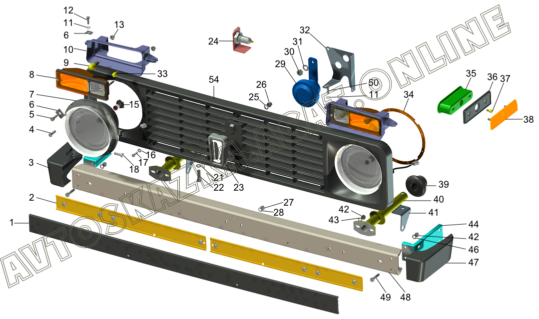 Передний бампер, облицовка радиатора и передние световые приборы ВАЗ 2131 (2131-01, 2131-41)