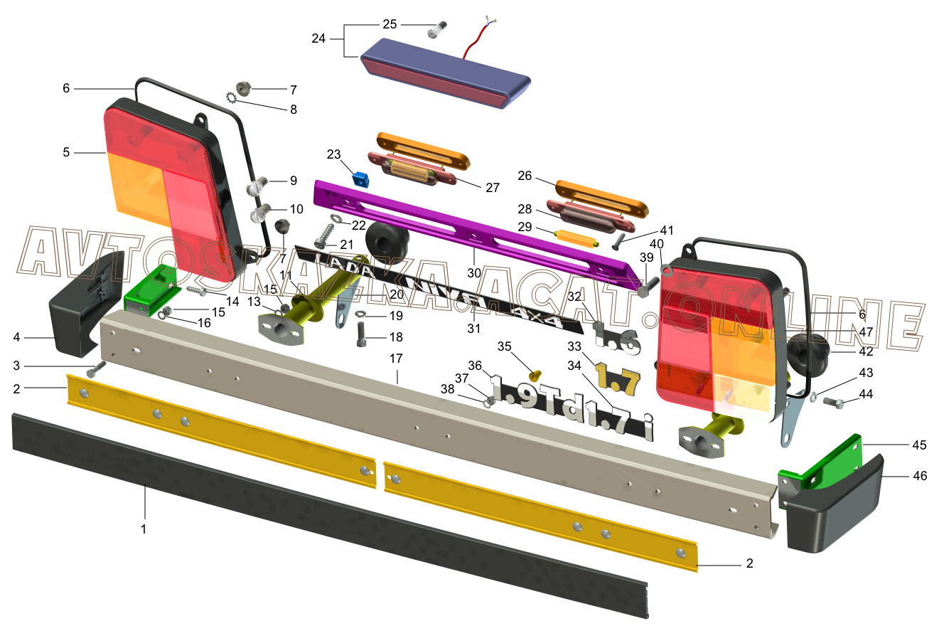 Задний бампер, задние световые приборы и облицовочные накладки ВАЗ 2131 (2131-01, 2131-41)