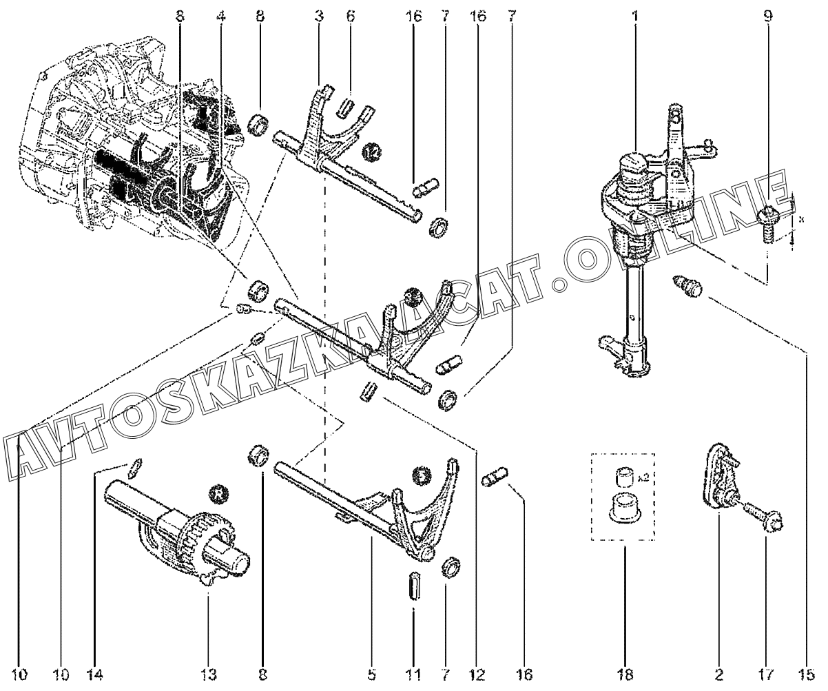 | Название детали: | Ось заднего хода с промежуточной шестерней в сборе |