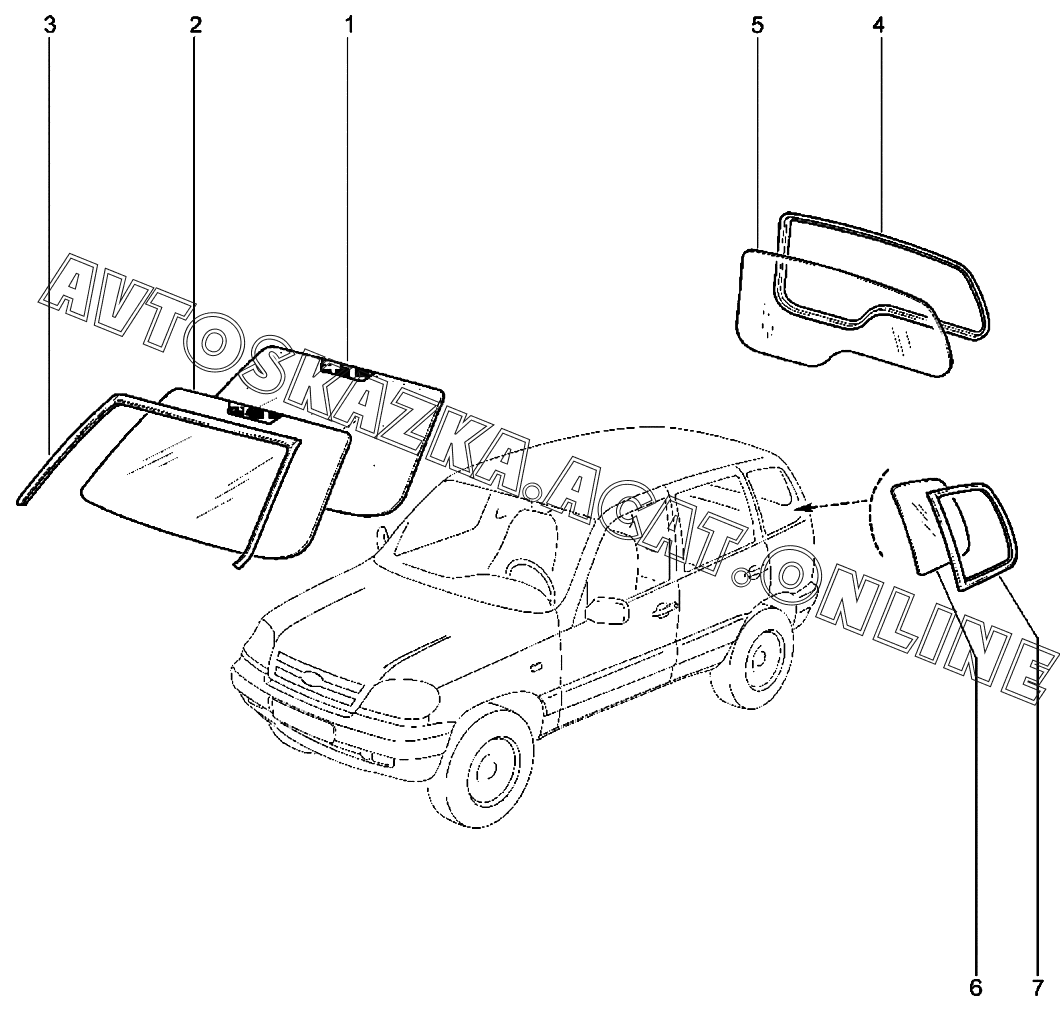 Стекла ВАЗ 2123 Niva Travel (2123 Niva Travel (Classic, Comfort, Comfort Off-road, Luxe, Luxe Off-road))