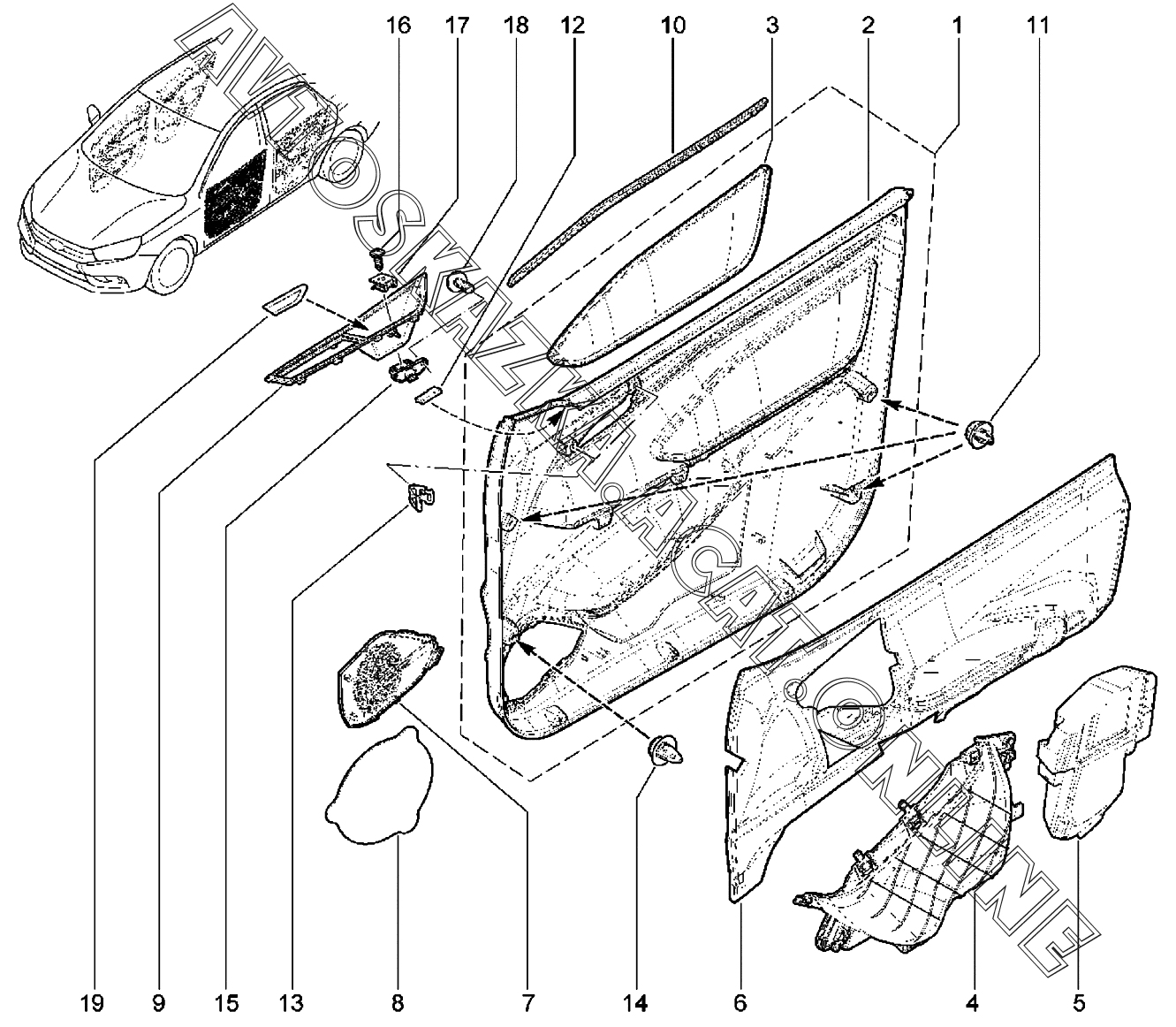 Обивка передней левой двери ВАЗ Vesta (2180 Lada Vesta (седан, универсал, CROSS, SW, SW CROSS, CNG, SPORT))