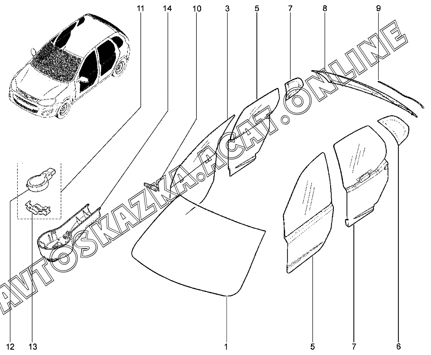 Стекла (периметр) (хетчбек) ВАЗ Kalina (2192, 2194 Lada Kalina (хэтчбек, универсал, CROSS))