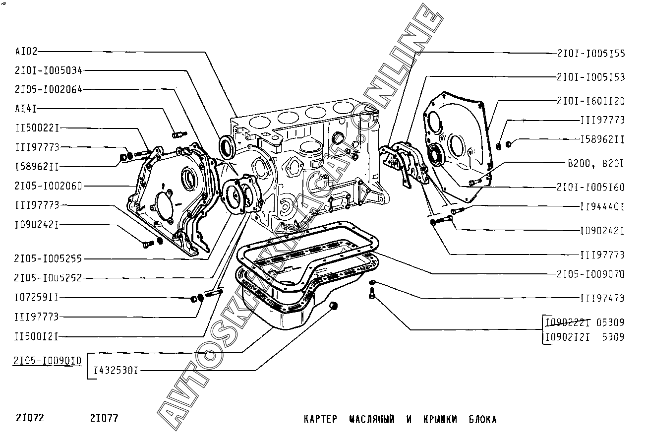 Картер масляный и крышки блока ВАЗ 2107 (2107-02, 21072, 21073-40, 210736-40, 21074, 21076, 21077, 21078)