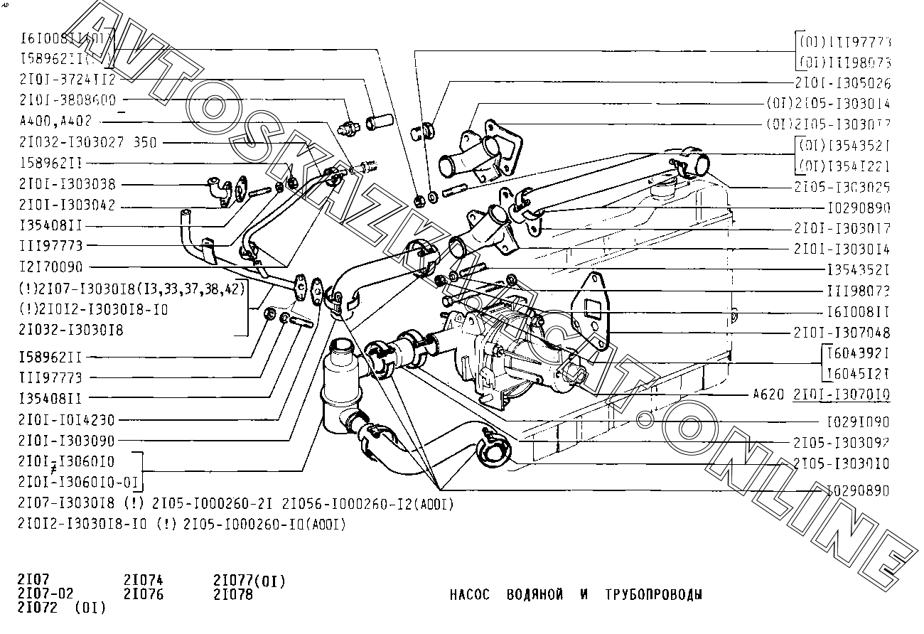 Насос водяной и трубопроводы ВАЗ 2107 (2107-02, 21072, 21073-40, 210736-40, 21074, 21076, 21077, 21078)