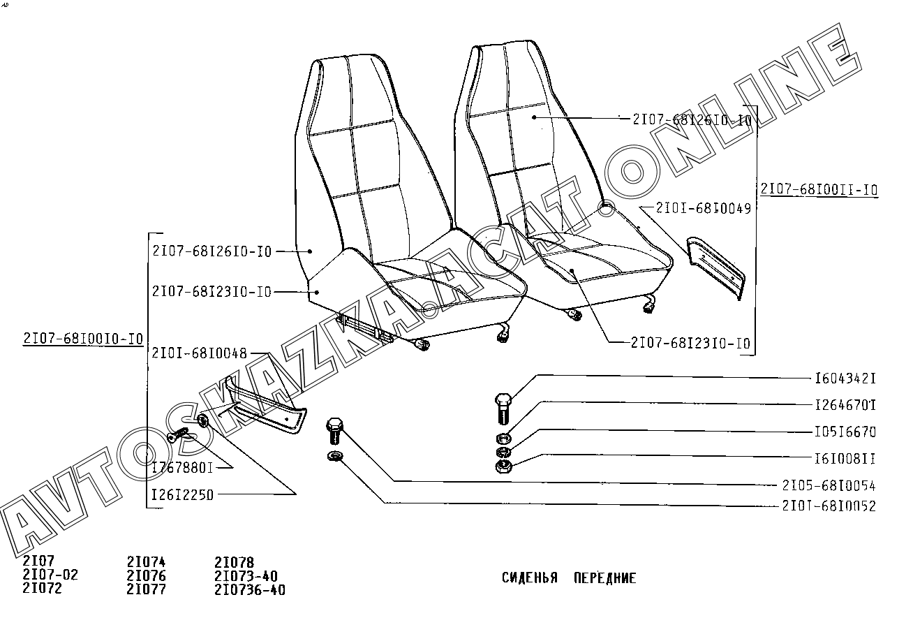 Сиденья передние ВАЗ 2107 (2107-02, 21072, 21073-40, 210736-40, 21074, 21076, 21077, 21078)